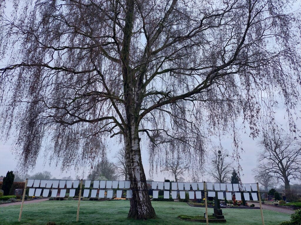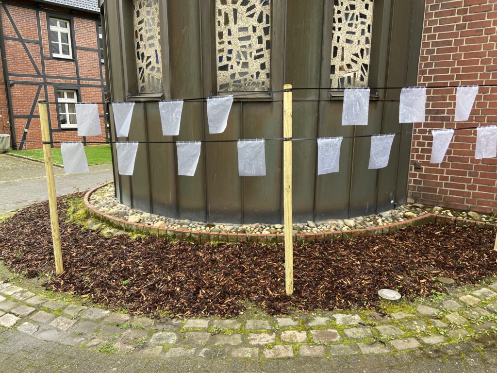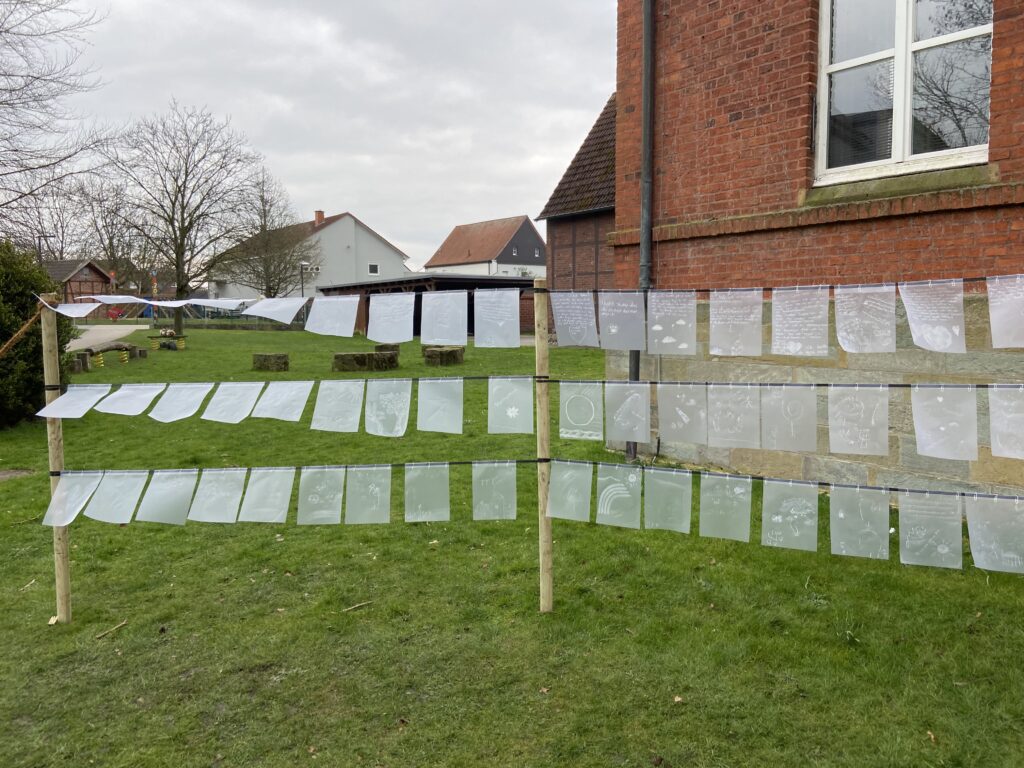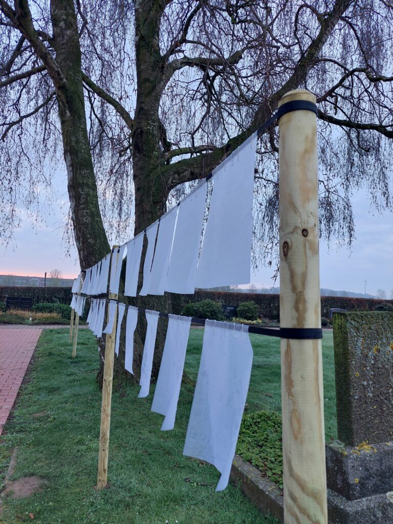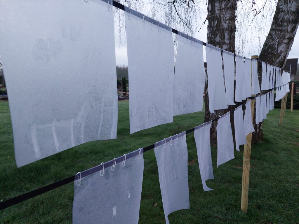 „Weiße Zeichnungen auf durchsichtigem Hintergrund lassen das Licht durchscheinen. Licht, das wir jenen, die wir verabschieden mussten, wünschen – wo auch immer sie sein mögen. Die Kinder senden ihre Gedanken mit den vom Wind bewegten Blättern auf die Reise“.